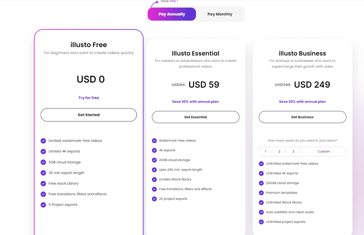 | Illusto Business | For startups or businesses who want to supercharge their growth with video | USD 249/USD 348 (Save 30% with annual plan) | – Unlimited watermark -free videos – Unlimited 4K exports – 200GB cloud storage – Premium templates – Unlimited iStock library – Auto subtitles and clean audio – Unlimited project exports |