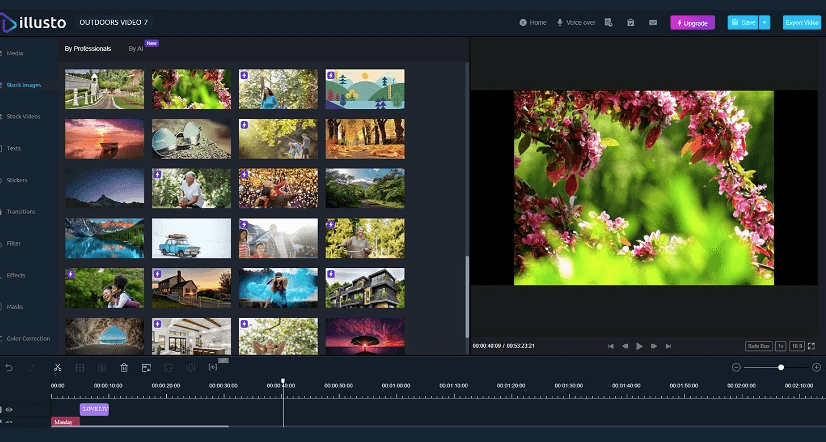 | Illusto Free | For beginners who want to create videos quickly | USD 0 | – Limited watermark -free videos – Limited 4K exports – 5GB cloud storage- 30 min export length – Free stock library – Free transitions, filters, and effects – 5 project exports |