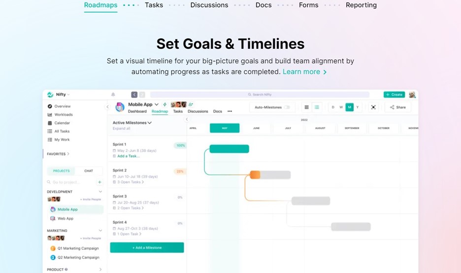 Nifty Project Management is an all-in-one platform for project tracking, team collaboration, and milestone dependency. It’s designed to simplify the process of managing projects from start to finish.