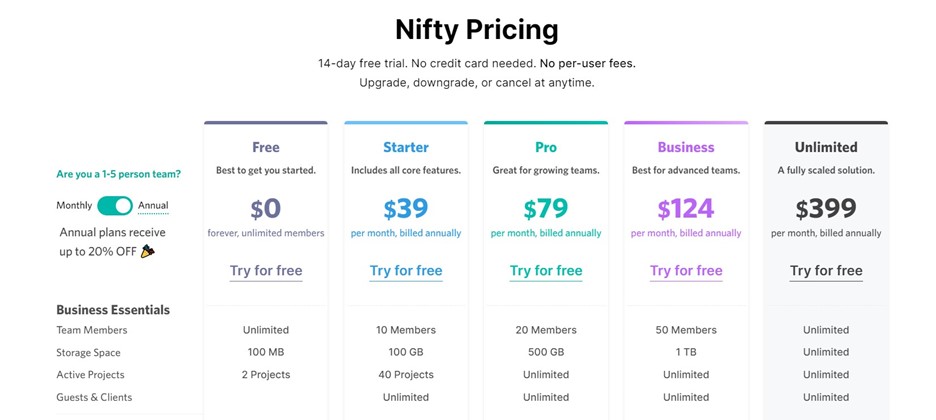Nifty offers a 14-day free trial for all plans, without requiring a credit card.