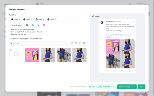 - Hootsuite- Generate creatives on Ocoya and send them out via Hootsuite.