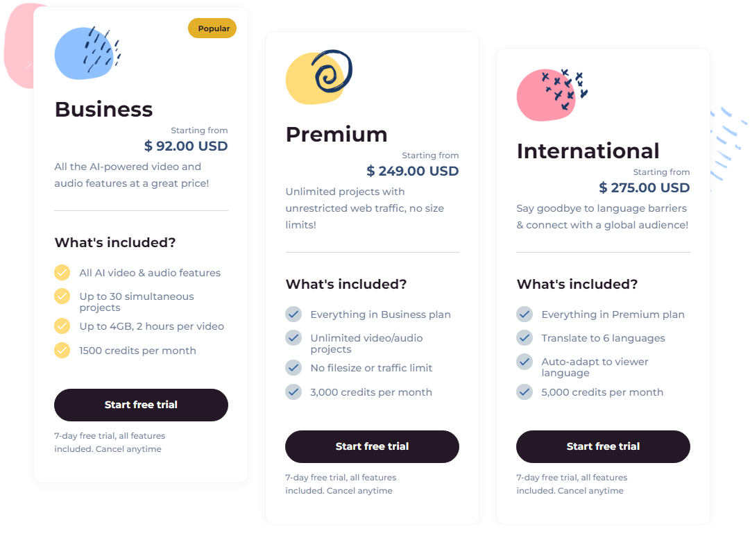 - Business Plan: Up to 30 simultaneous projects, 4GB/2 hours per video, 1500 credits/month.