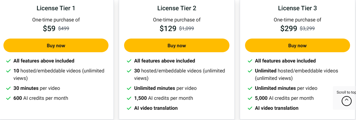 - License Tier 3: The most comprehensive package, offering unlimited video hosting and the highest number of AI credits. This tier is perfect for large businesses or frequent video content creators who need extensive editing capabilities and translation services.