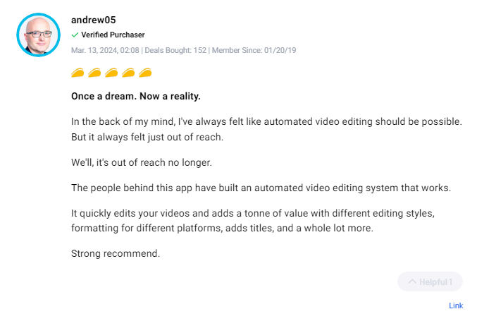 Before OneTake AI, I thought only experts could make professional videos. This bargain proved me wrong. It’s so easy to use that even a novice editor like me can make professional-looking videos. Everything from simple cuts to complex transitions and effects, is included. My videos are now polished and professional.