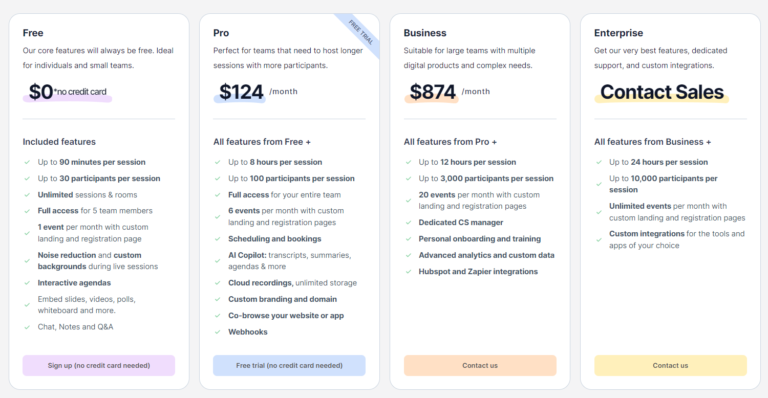 Platform Features | Video conferencing, Interactive agendas, Events, Rooms, Landing Pages, Co-browsing, Calendar, Breakout rooms, Chat, Whiteboards, Polls, Takeaways, Custom branding, Custom domain, Cloud recording, Bookings | – | – | – |