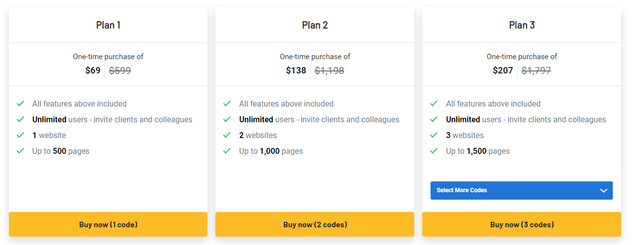 | Plan 1 | $69 ($599 value) | Access to 1 website (up to 500 pages), unlimited users, export all reports to CSV, download Word reports |