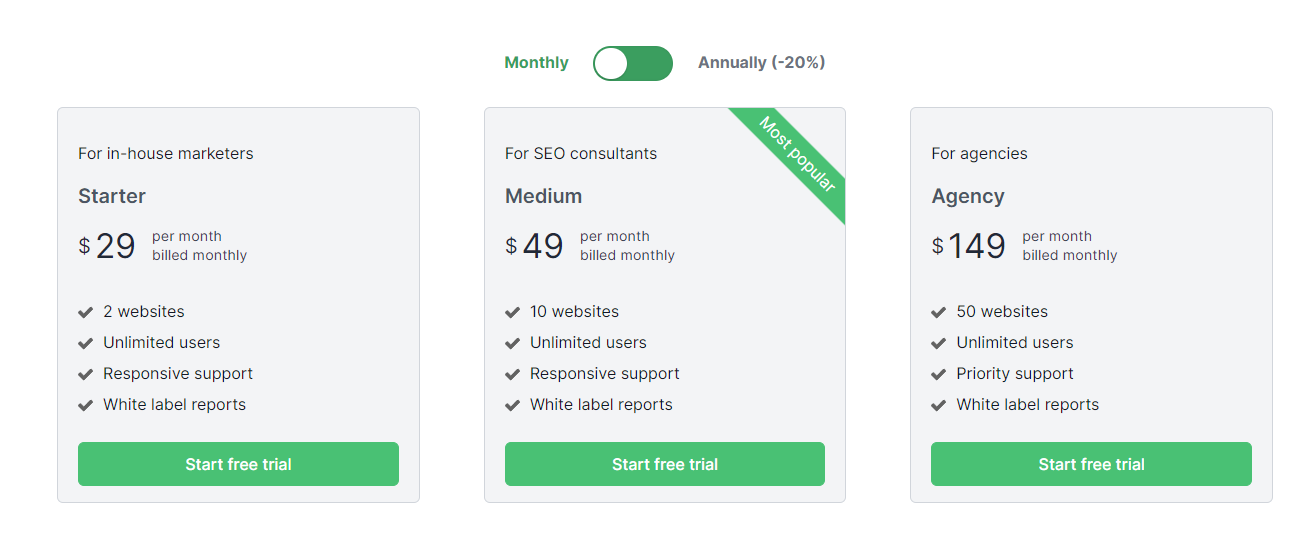 This tool also lets you add up to 20 websites and make white-label PDF reports, which give your SEO reporting a professional and unique touch.
