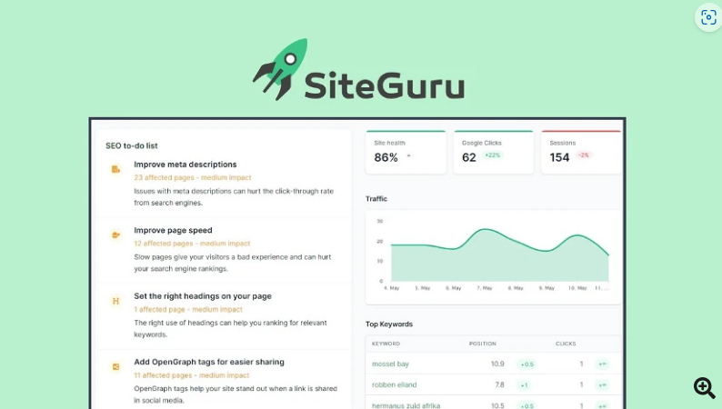 SiteGuru stands out for its capacity to identify duplicate material, guarantee accurate search engine indexing, and offer a useful, actionable SEO to-do list. The application effectively combines data from Google Analytics and Google Search Console to help users keep track of their SEO success.