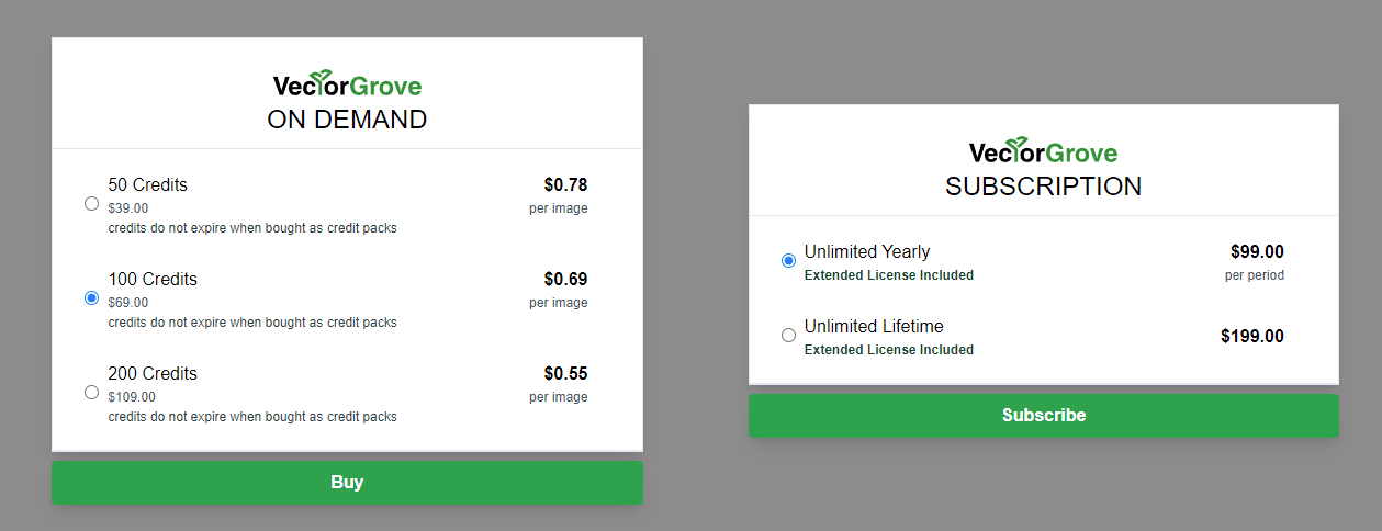 | Purchase Method | Buy vectors via credit packs or monthly subscription |