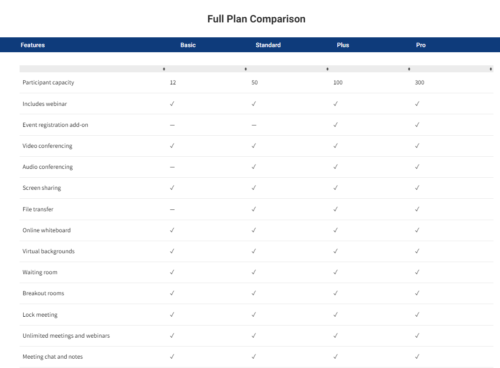 | – All features above included – 1 Basic Plan Host – Up to 12 attendees – Webinar mode – Web conferencing – Screen sharing & file transfer – Online whiteboard – HD video conferencing – IOS and Android mobile apps – Virtual backgrounds -Waiting room and Breakout rooms – Music on hold – Annotation and Polling – Team chat – Account administration – Support level (email, chat) – Purchase more licenses if you need more hosts |