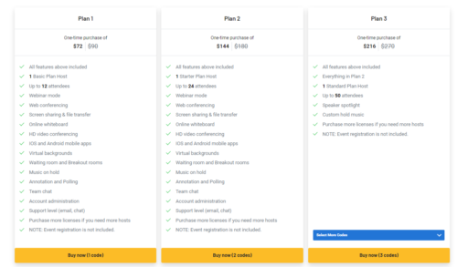 – All features above included – Everything in Plan 2 – 1 Standard Plan Host – Up to 50 attendees – Speaker spotlight – Custom hold music – Purchase more licenses if you need more hosts – NOTE: Event registration is not included. |