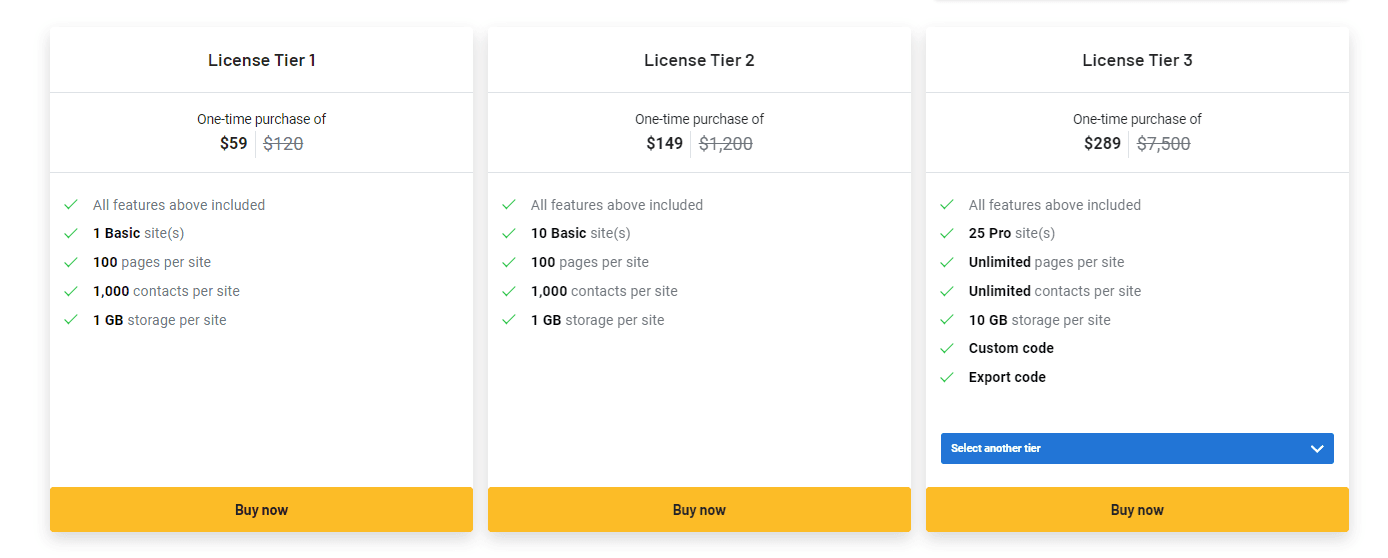 | License Tier 3 | $289 | $7,500 | All features above included, 25 Pro sites, Unlimited pages per site, Unlimited contacts per site, 10 GB storage per site, Custom code, Export code |