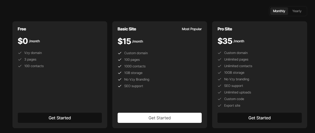 | Basic Site (Most Popular) | $15/month | – Custom domain- 100 pages- 1,000 contacts- 1GB storage- No Vzy Branding- SEO support |