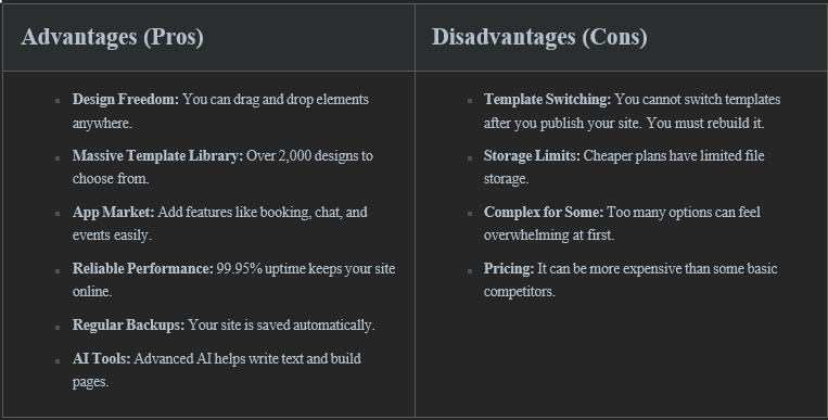 There is also a page limit of 100 static pages. For most sites, this is plenty. But huge sites might hit this limit. Dynamic pages (like product pages) do not count toward this limit. Finally, migration is difficult. If you want to leave Wix later, you cannot simply export your code to another host. You would have to copy your content manually.