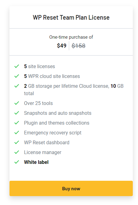 | Plans & Features | WP Reset Team Plan License |